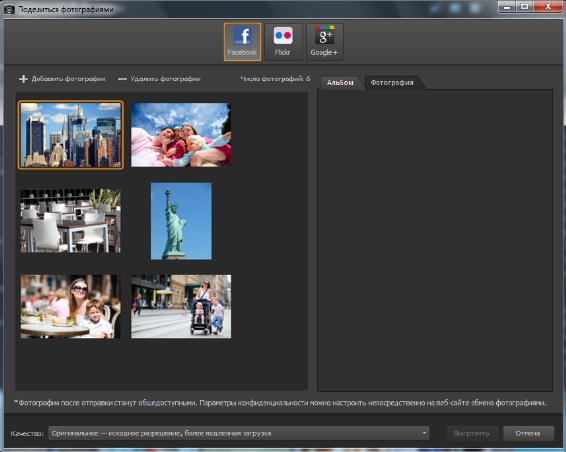 Фотографии можно выгружать на сайты обмена, например, Facebook, Flickr и Google+.