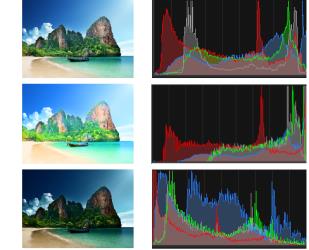 Beispielhistogramme (rechts) für drei unterschiedliche Belichtungen.