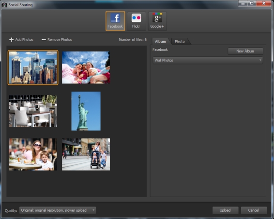 Wenn Sie über eine aktive Internetverbindung verfügen, können Sie Ihre Fotos direkt aus der Anwendung auf Sharing-Websites wie Facebook, Flickr und Google+ hochladen.