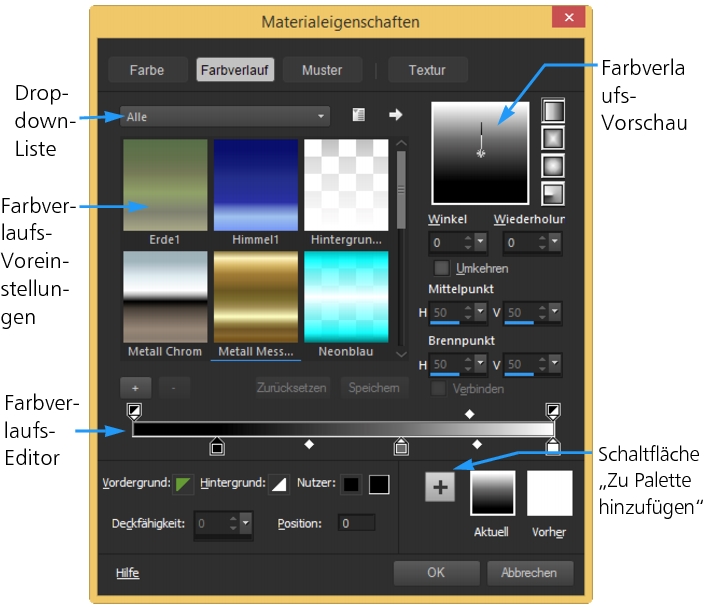 Auf der Seite „Farbverlauf" im Dialogfeld „Materialeigenschaften" können Sie Farbverläufe auswählen und bearbeiten.