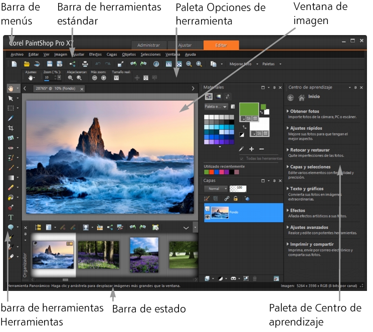 Corel PaintShop Pro está formado por tres espacios de trabajo: