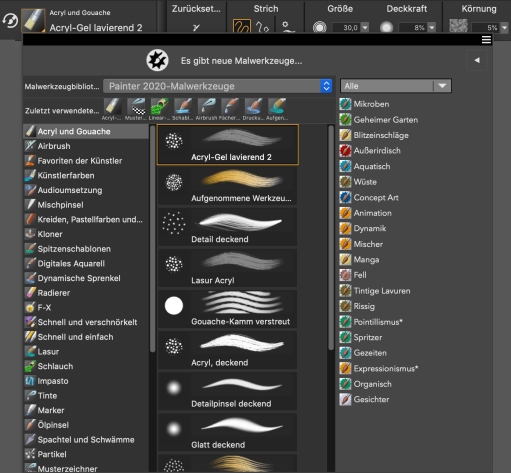 Die Malwerkzeugpakete, die Sie kaufen, werden der standardmäßigen Bibliothek mit den Painter 2020-Malwerkzeugen hinzugefügt. Wenn Sie eine andere Malwerkzeugbibliothek benutzen – beispielsweise Painter 2016-Malwerkzeuge – müssen Sie zur standardmäßigen Bibliothek mit den Painter 2020-Malwerkzeugen wechseln, um auf die neuen Malwerkzeugpakete zugreifen zu können.