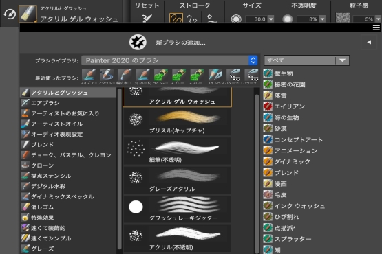 購入したブラシ パックは、デフォルトの Painter 2020 Brushes ライブラリに追加されます。Painter 2016 Brushes などの別のライブラリを現在使用している場合、新しいブラシ パックにアクセスするには、デフォルトの Painter 2020 Brushes ライブラリに切り替える必要があります。
