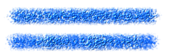 [奥行きのジッター] が適用されたブラシストローク: ジッターの滑らかさなし (上側) と ジッターの滑らかさなしあり (下側)