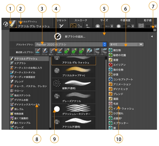 丸で囲まれた番号は、以下の表の番号に対応します。この表では、ブラシ セレクタのメイン コンポーネントについて説明します。
