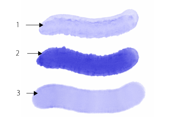 [細目ドット] フロー マップが選択された 3 つの [リアル水彩] ブラシ バリアントを使ったブラシストローク