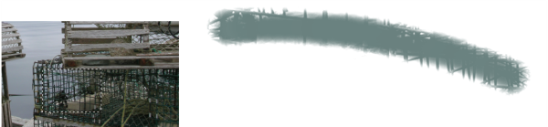 イメージの領域を選択し、用紙テクスチャを作成しました (左)。新しい用紙テクスチャを使用し、キャンバスにブラシストロークを適用した様子です (右)。