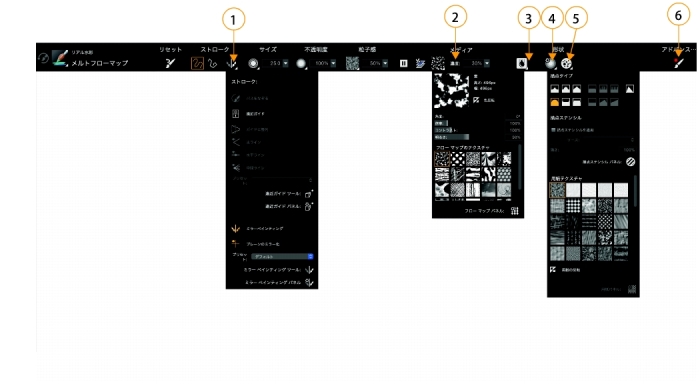 リアル水彩ブラシ バリアントのプロパティ バー: (1) [ストローク] フライアウト、(2) [フロー マップ] フライアウト、(3) [リアル水彩] フライアウト ボタン、(4) [描点オプション] フライアウト、(5) [ブリスル] フライアウト ボタン、(6) [詳細ブラシ コントロール] ボタンを使用すると、アクティブなブラシ バリアントに関連するパネルにアクセスできます。アイコンの背景の形は用途を示しています。正方形の背景 (3) は、ブラシのメディアのプロパティを変更する設定にアクセスできることを示します。丸い背景 (4、5) のアイコンでは、ブラシの形状を制御する設定にアクセスします。