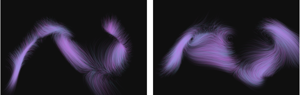 フロー粒子ブラシは、ブラシストロークの中心からキャンバスに全体に流れ出て、徐々に消えていく寿命の短い粒子を放出します。この動きは、花火の動きに似ています。粒子は流れの中で、パスを変化させる力にぶつかります。そのため、無秩序な動きや制御された動きになります。フロー ブラシは、力、カオス、およびフロー マップの影響を受けやすいブラシです。フロー マップについて詳しくは、フロー マップを適用および調整する.を参照してください。