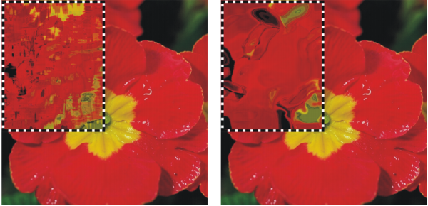 ガラス越し効果ダイナミック レイヤーの置き換えソースとして [テクスチャ] を使用したイメージ (左) と [画像の明るさ] を使用したイメージ (右)