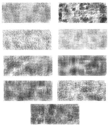 通常、ブラシストロークを作成するとき、用紙の粒子は固定されます。つまり、テクスチャは同じ位置にあります。有機的で反復しない外観の跡にするには、ブラシストロークの描点ごとに用紙の粒子の位置を変えたり ([ランダムな粒子感の位置])、新しいブラシストロークごとに用紙の粒子を回転したり ([ランダムな粒子感の回転]) することができます。