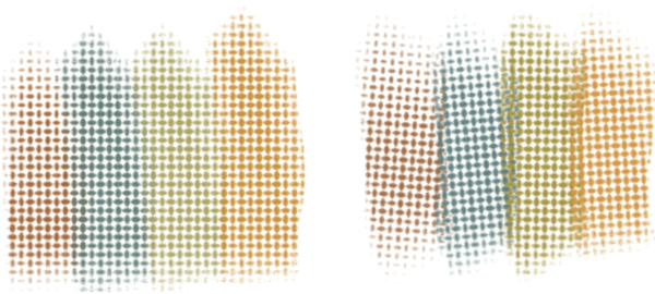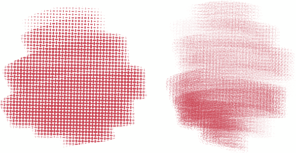 [ランダムな粒子感の位置] が無効なブラシストローク (左) および有効なブラシストローク (右)。粒子の位置は、ブラシストロークの描点ごとに変化します。