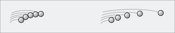 重力粒子ブラシでは、動きによって大きく伸縮するスイープ パスが作成されます。重力粒子ブラシでの粒子の動きは、惑星の動きに似ています。つまり、粒子のパスは、速度、加速度、およびその他の力によって大きく影響を受けます。ストロークの速さに応じて、粒子はブラシストローク内で密にとどまったり、力によって大きく引き離されたりします。