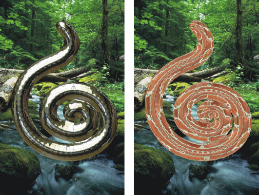 イメージの上に水滴を乗せれば、屈折による歪みが出ます。また、水銀のように流動する液体金属の塊も作成できます。[屈折度] スライダは、媒体の性質を調整し、水と金属の中間的な効果を作成します。ネガティブなメタルを使用して、メタルに穴を開けることもできます。