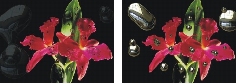 [量] ― [屈折] スライダで設定されている効果の度合いを調整し、レイヤー内のすべての水滴に適用します。水のような効果を作成するには、[量] を –0.5 に設定します。これにより、水滴の下にあるイメージが大きく見えます。 |