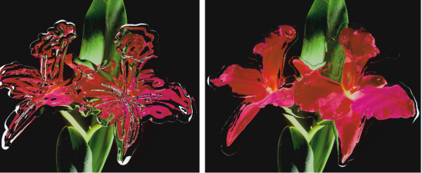 [スムーズ] スライダの値を低くして個々の水滴を区別したイメージと (左)、値を高くして水滴をくっつけたイメージ (右)