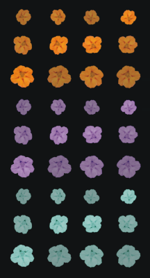 ノズルに 3 つ目の変化を加えるには、3 ランクのノズルを作成します。この場合も、イメージ部品の選択に使用する入力データは別々のものにする必要があります。2 つのランクを同じ入力データで制御しようとすると、一部のイメージ部品が使用されません。次のイメージでは、ランク 3 で色が変化します。ランク 3 は、イメージのデザインに応じてランダム、速度、クローンソースなどで制御できます。