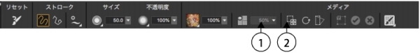 テクスチャの可視性は、プロパティ バーのコントロールを使って素早く調整できます。(1) [テクスチャの表示] ボタン、(2) [可視性] スライダ
