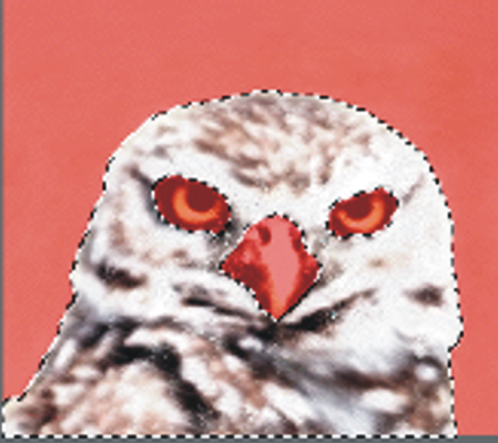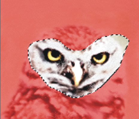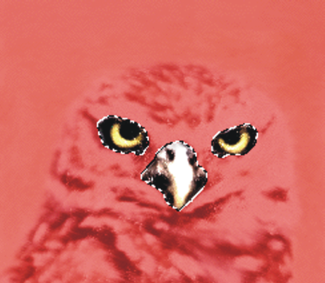 以下のようなフクロウのイメージで、目、くちばし、輪郭など個別に作業できるよう、それぞれのパーツごとに選択範囲を作成して保存します。これらのイメージで選択範囲がはっきりとわかるようにするため、各選択範囲をチャンネルに保存し、再読み込みし、赤のオーバーレイとして表示します。詳細は、チャンネルの表示/非表示を切り替えるには.を参照してください。