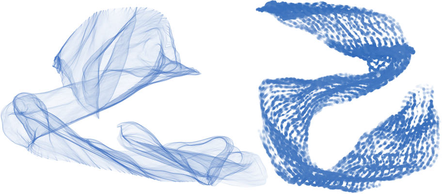 重力粒子のブラシストローク (左) およびダイナミックスペックル重力粒子のブラシストローク (右)