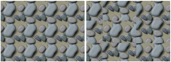 [表面テクスチャの適用] などの効果の適用で生じる継ぎ目を多少とも回避するには、[表面テクスチャ効果] の設定を弱く ([量] スライダを動かす) します。パターンの中心をずらしながら (パターン化されているときは、Shift + スペースバーでパターンの中心がずらせます)、何度かにわけて適用します。この方法を使えば、継目が分散するので目立たなくなります。