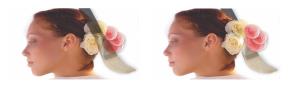 この例では、筆のイメージがレイヤーに含まれています。左の図では、筆のレイヤーは一番上に表示されています。右の図では、筆のレイヤーは一番下に表示されています。