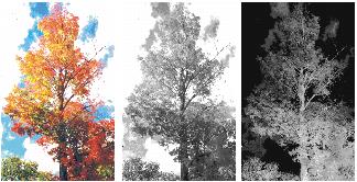 イメージ (左)、イメージの明るさに基づいて作成したチャンネル (中央)、輝度を反転したイメージ (右)