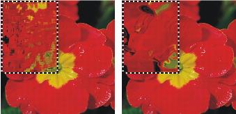 [柔らかさ] ― 置き換えられた色の移行部分を調整します。設定値を高くすると、より多くの移行段階が作成され、変化が滑らかになります。ガラス越し効果を作成した結果、イメージがぎざぎざになった場合は、柔らかさの値を上げてみてください。 |