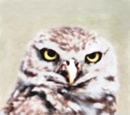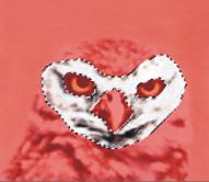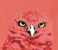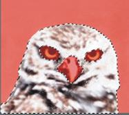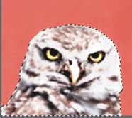 以下のようなフクロウのイメージで、目、くちばし、輪郭など個別に作業できるよう、それぞれのパーツごとに選択範囲を作成して保存します。これらのイメージで選択範囲がはっきりとわかるようにするため、各選択範囲をチャンネルに保存し、再読み込みし、赤のオーバーレイとして表示します。詳しくは、チャンネルの表示/非表示を切り替えるには.を参照してください。