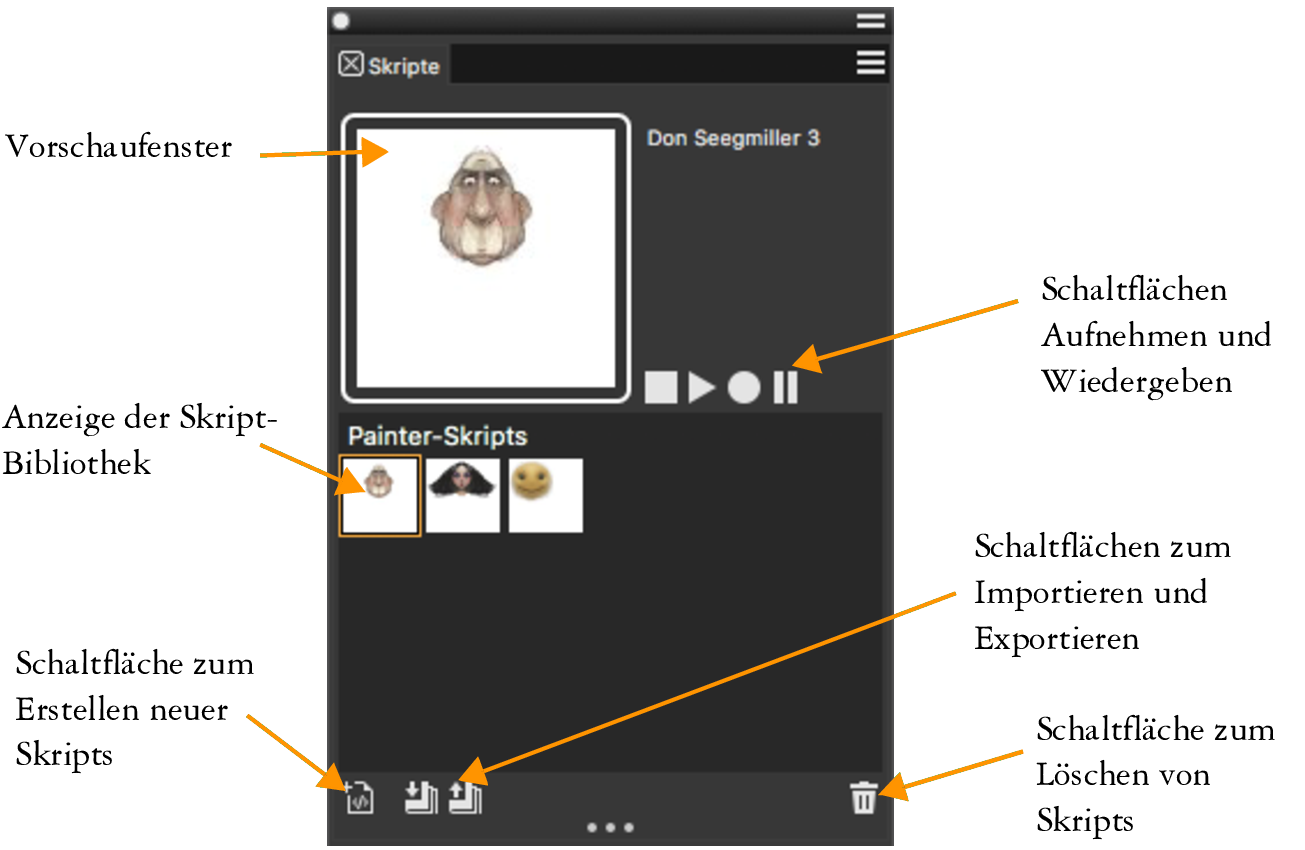 Das Bedienfeld Skripts ermöglicht das Aufnehmen, Abspielen und Bearbeiten von Skripts. Zudem ermöglicht es den Zugriff auf die Anzeige für Skript-Bibliotheken, mit der die Skripts und Skript-Bibliotheken, die Sie erstellen, gespeichert und verwaltet werden können.