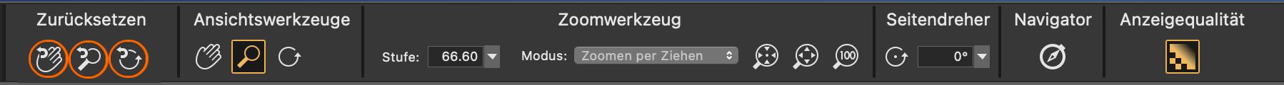 Verschiedene Werkzeug zurücksetzen-Schaltflächen für die Eigenschaftsleiste des Hilfsmittels Hand