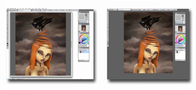 In Corel Painter 2016 ist es nun noch einfacher, zwischen verschiedenen Dokumentansichten zu wechseln, wenn Sie beispielsweise an einem Projekt arbeiten oder jemandem Ihre Arbeit oder eine bestimmte Technik zeigen. Die Dokumentansicht kann über die Werkzeugpalette, das Fenster-Menü und mithilfe von Tastenkürzeln umgeschaltet werden. In der Standardansicht werden alle offenen Dokumente zusammen mit den am häufigsten benutzten Anwendungselementen angezeigt; in der Einzeldokumentansicht hingegen können Sie sich ganz auf das aktive Dokument konzentrieren. Im Präsentationsmodus werden die Menüleiste und die Taskleiste des Betriebssystems ausgeblendet, sodass nur noch die wichtigsten Steuerelemente zu sehen sind. Weitere Informationen finden Sie unter Dokumentansichten wechseln.