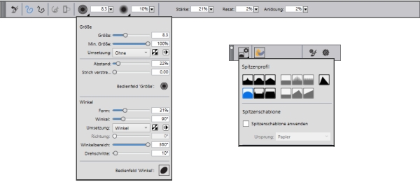 Die Optimierung der Malwerkzeug- und Werkzeug-Einstellungen ist wichtig. Aber wenn man viel Zeit mit der Justierung der Einstellungen verbringt, hat man weniger Zeit zum Malen. Die Eigenschaftsleisten wurden deshalb optimiert, um Ihnen das Anpassen der Malwerkzeuge zu erleichtern. Wenn nun beispielsweise das Malwerkzeug aktiv ist, gibt Ihnen die optimierte Eigenschaftsleiste schnellen Zugriff auf eine Reihe relevanter Bedienfelder für das Malwerkzeug, damit Sie weniger Zeit damit verlieren, sich durch verschiedene Menüs zu klicken. Sie können darüber hinaus schnell neue Spitzenprofile und Papiere und andere Medien auswählen sowie Informationen zum Malstrich einsehen. Zudem gibt Ihnen die neue erweiterte Eigenschaftsleiste schnellen Zugriff auf weitere Einstellungen. Weitere Informationen finden Sie unter Unter Verwendung der Eigenschaftsleiste mit Malwerkzeugen arbeiten