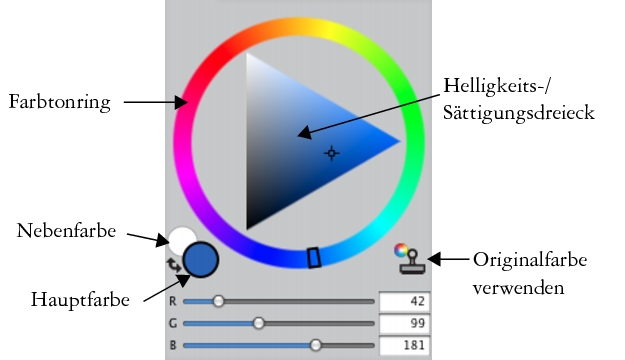 . Die Farbfelder in Corel Painter funktionieren anders als die Quadrate für die Vordergrundfarbe und die Hintergrundfarbe in Photoshop. Um die Farbe zu ändern, können Sie auf das Farbfeld Hauptfarbe oder Nebenfarbe doppelklicken und dann im Farbtonring eine neue Farbe auswählen. Sie können auch auf das Helligkeits-/Sättigungsdreieck klicken und eine neue Tönung oder Schattierung wählen. Sie können Nebenfarben zum Erstellen von Verläufen oder zur Verwendung von Malwerkzeugen mit mehr als einer Farbe nutzen. Im Unterschied zur Hintergrundfarbe in Photoshop verändert die Nebenfarbe die Arbeitsfläche nicht.