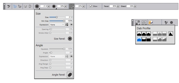 Optimizing brush and tool settings is important. But time spent tweaking controls is time not spent painting. That's why the property bars have been enhanced to make it easier to adjust brushes. For example, when the Brush tool is active, the enhanced property bar gives you quick access to a range of relevant brush-related panels, saving you time clicking through menus. It also lets you choose new dab profiles on the fly, select media like paper, and view brushstroke info. There’s also a new Extended property bar that gives quick access to even more settings. For more information, see Working with brushes using the property bars.