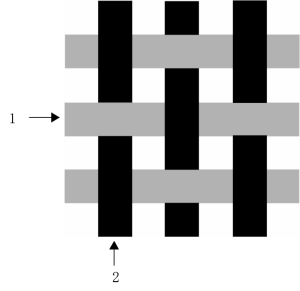 1) グレーの横糸と 2) 黒の縦糸を使用した単純なテキスタイルの例