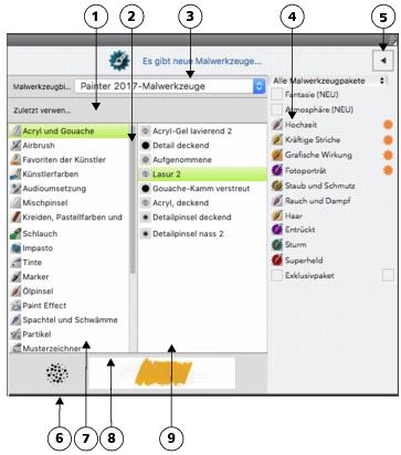 Die Malwerkzeugauswahl ist auch als frei verschiebbares Bedienfeld verfügbar, das offen gehalten werden kann, um beim Malen schnell und einfach auf die Malwerkzeuge zuzugreifen. Weitere Informationen zum Gruppieren, Vergrößern, Verkleinern und Andocken der Bedienfelder finden Sie unter Anordnung von Bedienfeldern und Paletten ändern.