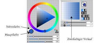 Sie können sehr einfache und sehr komplexe Verläufe erstellen. Um einen einfachen zweifarbigen Verlauf zu erstellen, müssen Sie lediglich eine Haupt- und eine Nebenfarbe auswählen. Corel Painter generiert dann die Verlaufsfarben aus diesen Farben.