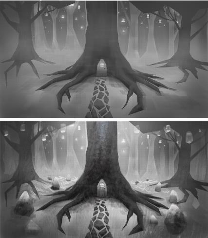 Eine Graustufen-Illustration (oben); in den Baum wurde eine Struktur eingearbeitet (unten). Illustration von Justin Buus.