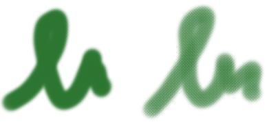 La force du pochoir de forme est définie sur 100 % pour les trois traits, mais la force minimale varie de 0 à 87 %. Les paramètres minimaux supérieurs donnent un pochoir de forme dont l’opacité minimale est supérieure et produit une forme plus distincte (à droite).