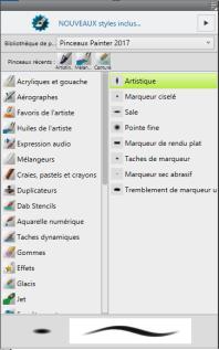 Corel Painter 2017 accélère et facilite l’accès à l’un des éléments qui font de Painter le chef de file de la peinture numérique : notre choix incomparable de styles. À cette fin, vous pouvez désormais afficher le Sélecteur de styles sous forme de panneau. Les variantes de style récemment utilisées sont ainsi à portée de main, la Bibliothèque de styles aussitôt accessible en intégralité et vous pouvez placer la barre à l’endroit qui vous convient. Le Sélecteur de styles permet par ailleurs d’accéder directement aux packs de pinceaux les plus récents. Pour plus d’informations, voir la rubrique Affichage et personnalisation du Sélecteur de styles.