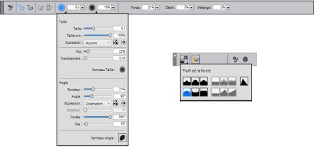 S’il est important d’optimiser les paramètres des outils et des styles, le temps passé à ajuster ces options n’est pas consacré à la peinture. C'est là la raison d'être des améliorations apportées : faciliter le réglage des différents styles. Par exemple, lorsque l’outil Styles est actif, la barre de propriétés étendue permet d’accéder rapidement aux divers panneaux associés, sans passer par les différents menus. Cette barre vous permet également de choisir de nouveaux profils de forme à la volée, de sélectionner une matière (par exemple du papier) et d’afficher les informations relatives aux traits. La nouvelle barre de propriétés étendue vous permet d’accéder rapidement à encore plus de paramètres. Pour plus d’informations, voir la rubrique Utilisation des pinceaux via les barres de propriétés.