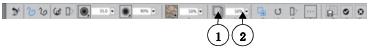テクスチャの可視性は、プロパティ バーのコントロールを使って素早く調整できます。(1) [テクスチャの表示] ボタン、(2) [可視性] スライダ