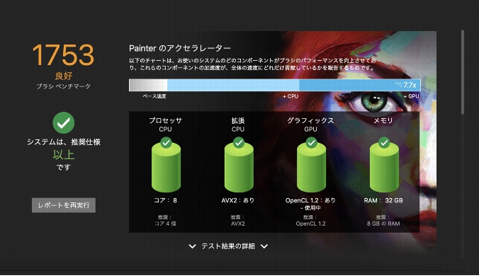 最高のデジタル ペイント体験を目指して、Painter 2020 から Brush Accelerator が導入されました。この新ユーティリティはシステムの CPU、GPU、メモリを評価したうえで、アプリケーションの設定を最適化することで、最大限のパフォーマンスを引き出します。多くの Painter ブラシが、システムの GPU の処理能力を活かして、ブラシの動作をより速く、ドキュメントのレンダリングや操作をより滑らかにできます。また、システム要素のアップグレードに関する提案や、使用コンピュータと相性のいいブラシ カテゴリの推奨もなされます。