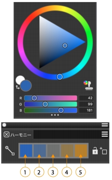 詳しくは、[カラー] パネルから色を選択する、[カラー] パネルの構成要素を表示する/隠す、カラー セレクタを使用する、カラー ハーモニーを使用する.を参照してください。