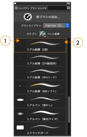 コンパクト ブラシ セレクタ:機能強化された描点 (1) とストローク (2) のプレビュー