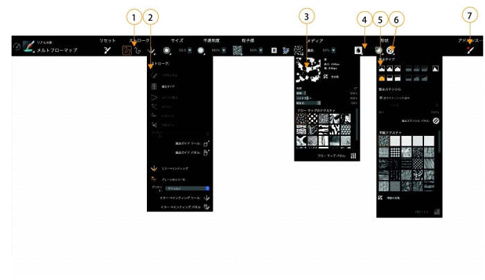 ブラシやツールのプロパティ バーやフライアウトが刷新され、とりわけ重要なコントロールにすぐ手が届くようになっています。(1) グループ ラベルで、コマンドを素早く効率的に探し、把握して、使うことができます。リアル水彩ブラシ バリアントのプロパティ バー: (2) [ストローク] フライアウト、(3) [フロー マップ] フライアウト、(4) [リアル水彩] フライアウト ボタン、(5) [描点オプション] フライアウト、(6) [ブリスル] フライアウト ボタン、(7) [詳細ブラシ コントロール] ボタンを使用すると、アクティブなブラシ バリアントに関連するパネルにアクセスできます。