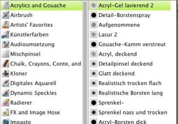 Im Werkzeugbibliotheks-Bedienfeld sind Malwerkzeuge in Kategorien organisiert, die Werkzeugvarianten enthalten. Malwerkzeugkategorien sind Gruppen mit ähnlichen Malwerkzeugen und Medien. Werkzeugvarianten sind spezielle Malwerkzeuge und Malwerkzeugeinstellungen innerhalb einer Malwerkzeugkategorie. So stehen beispielsweise in der Kategorie Pastellfarben Varianten für Pastellstift und Pastellkreide sowie für verschiedene harte und weiche Pastell-Malwerkzeuge zur Verfügung. Sie können die Anzeige der Kategorien und Varianten ändern. Weitere Informationen hierzu finden Sie unter Malwerkzeuge im Malwerkzeugbibliotheks-Bedienfeld organisieren und anzeigen.
