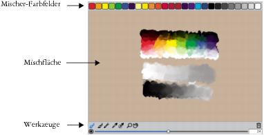 Mit den Steuerelementen des Panels Mischer werden Farben auf die Mischfläche aufgetragen, gemischt, Farbproben aufgenommen und Farben von der Mischfläche entfernt.