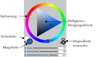 . Die Farbfelder in Corel Painter funktionieren anders als die Quadrate für die Vordergrundfarbe und die Hintergrundfarbe in Photoshop. Um die Malfarbe zu ändern, können Sie auf das Farbfeld Hauptfarbe oder Nebenfarbe doppelklicken und dann im Farbtonring eine neue Malfarbe auswählen. Sie können auch auf das Helligkeits-/Sättigungsdreieck klicken und eine neue Tönung oder Schattierung wählen. Sie können Nebenfarben zum Erstellen von Verläufen oder zur Verwendung von Malwerkzeugen mit mehr als einer Malfarbe nutzen. Im Unterschied zur Hintergrundfarbe in Photoshop verändert die Nebenfarbe die Arbeitsfläche nicht.